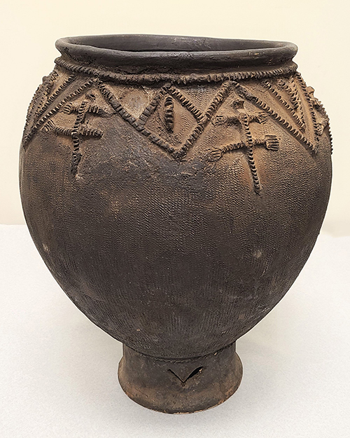 Pottery making is a very labor-intensive process, from digging the clay, to building the pots, to wood firing in open air. Potters start containers like this one by forming a slab of clay over a mold, often an old pot. The rough texture is created by a tool covered in netted fabric. After making the base, coils are added to complete the pot’s walls, lip, and base. After a pot is fired, the black color is created by submerging it in a bath of tree bark or acacia seed pods. Young girls often assist the women of their household to learn basic pottery skills. They will not make their own pottery, however, until they are married and have joined their husband’s family.