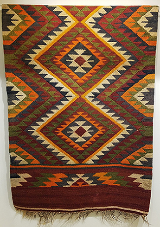 This Bedouin rug was purchased in Amman, the capital city of Jordan, but made in the ancient town of Madaba. The Arabic-speaking Bedouin are a nomadic people who live across the deserts of the Middle East and North Africa. Bedouins in the area of Jordan are traditionally sheep or goat herders, which allowed them to develop a strong weaving tradition using the wool gathered from their own herds. Weavers, conventionally women, make many items suited to a mobile life including rugs, pillows, and other domestic goods. Bedouin geometric patterns, like the ones found in this rug, influenced many other weavers around the world. Bedouin designs are found across North Africa, which influenced the Spanish, which in turn inspired Navajo designs once they arrived in the New World. The rug is currently on display in the Museum in preparation for our July 23 workshop on world textiles.